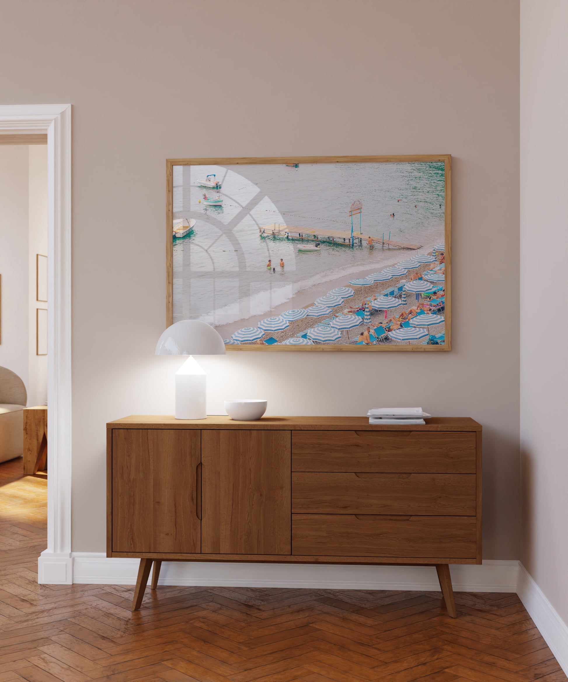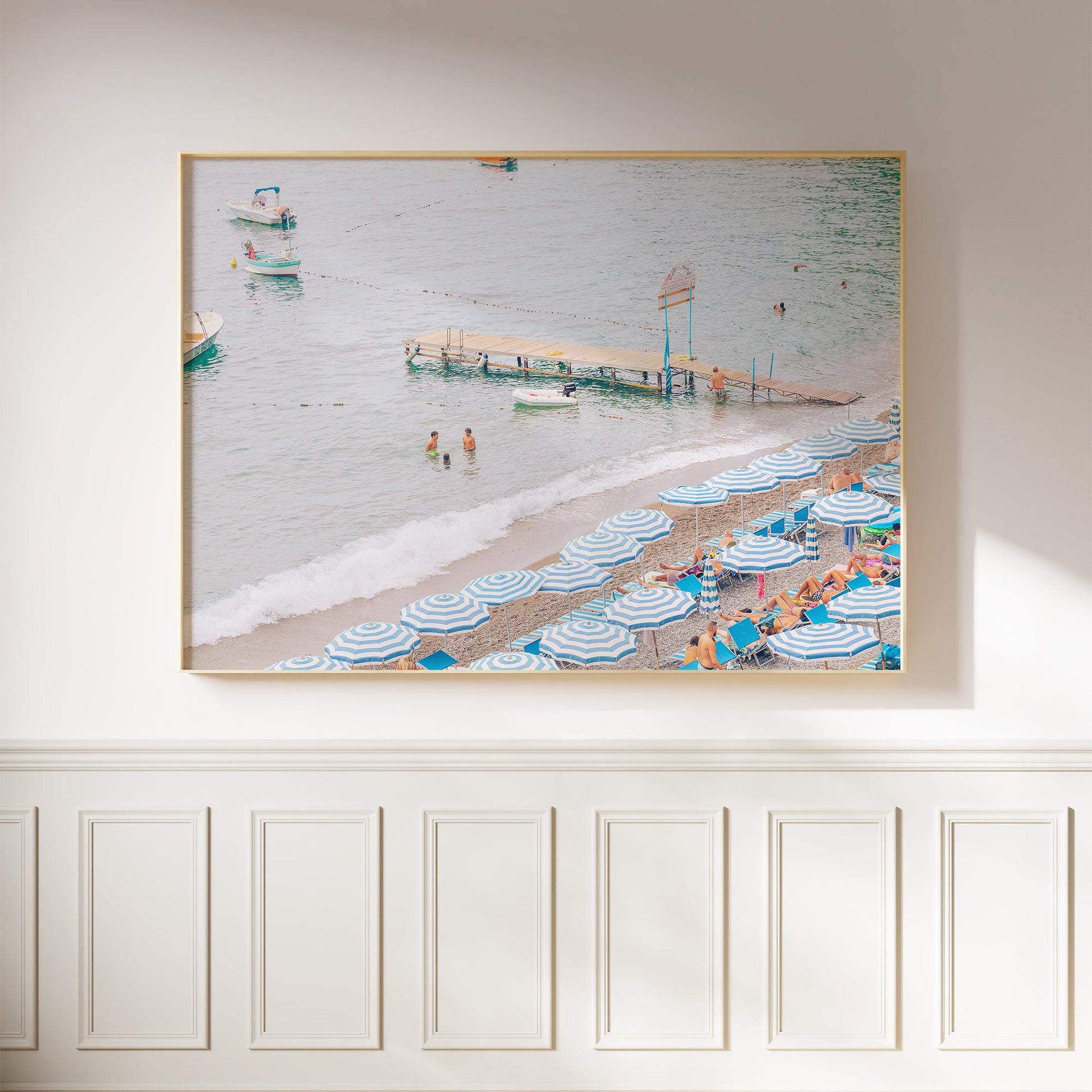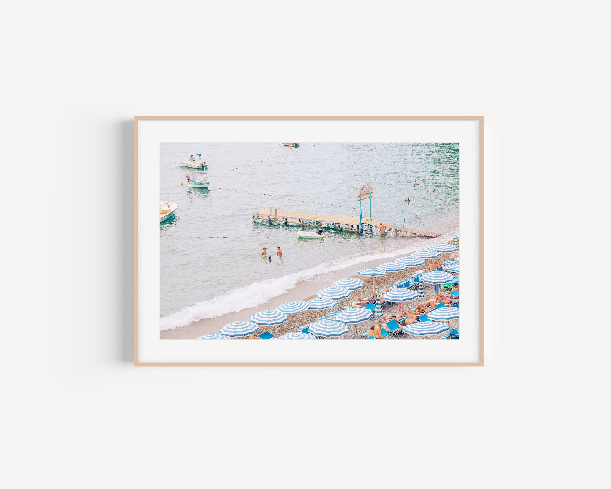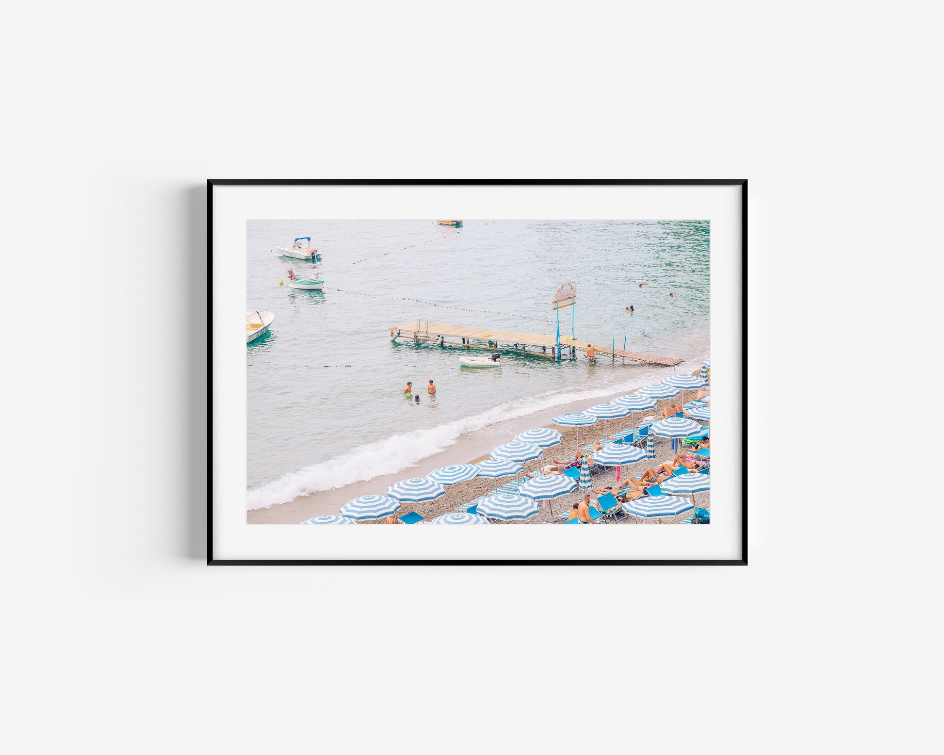 Live your coastal dream with our Coastal Dream Photography Print. This stunning image captures the serene beauty of Positano's beaches, dotted with colourful umbrellas and surrounded by rugged cliffs. Perfect for any beach lover or nature enthusiast.