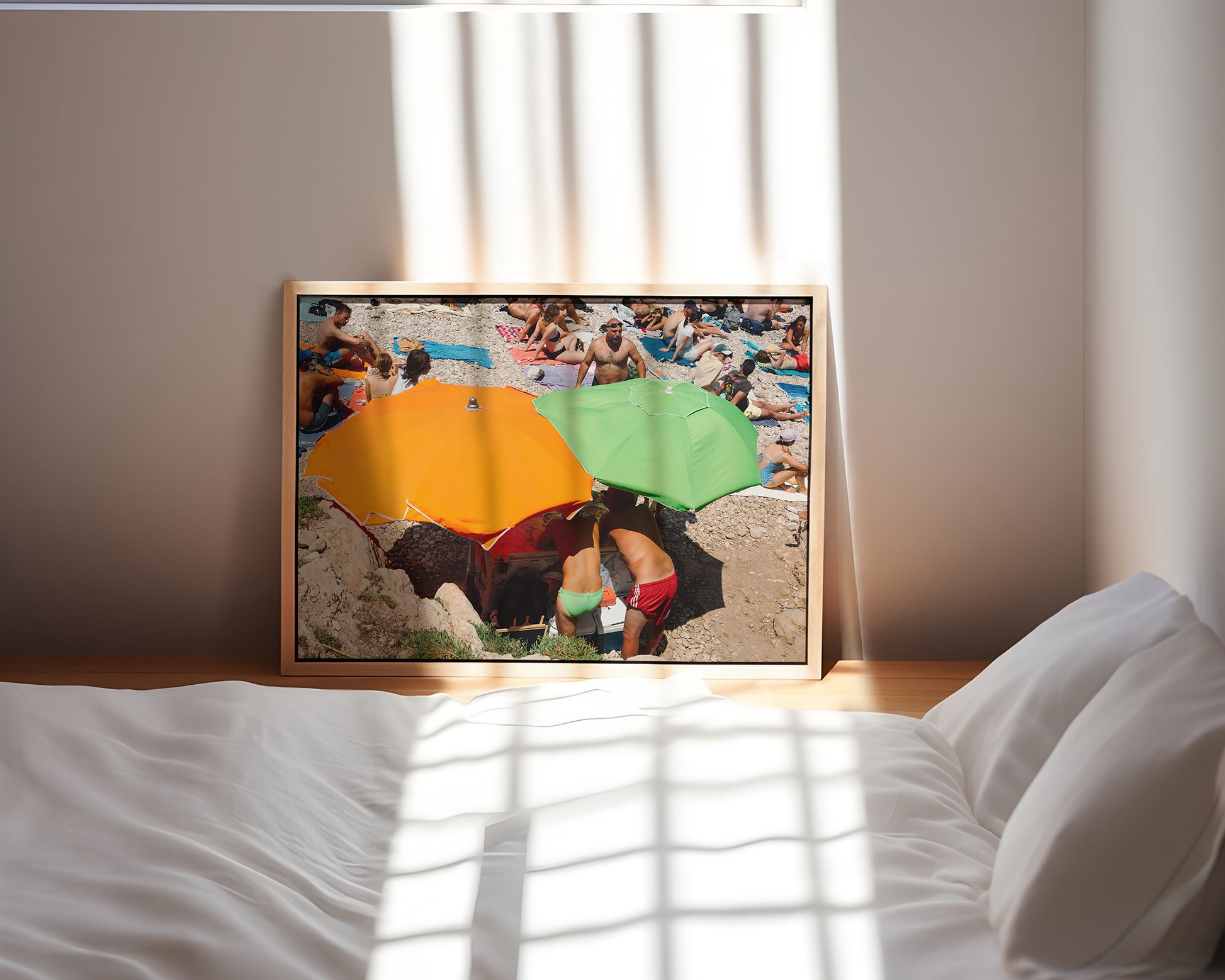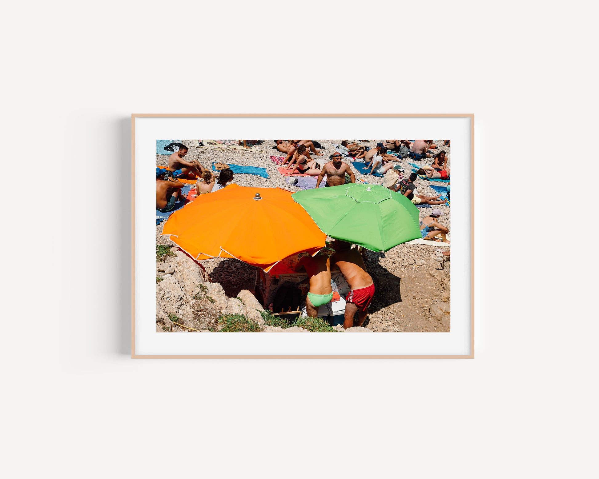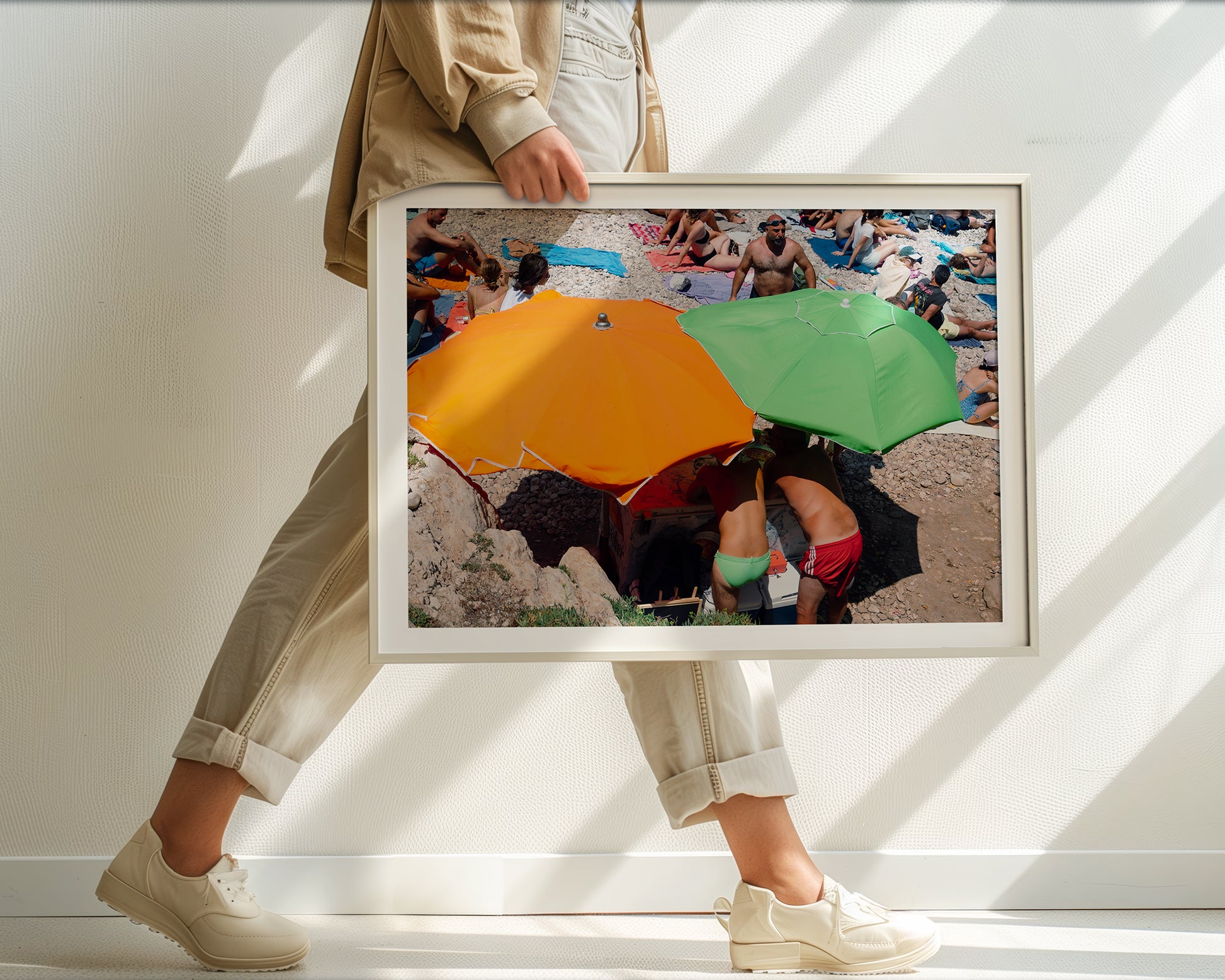 Under the shade of bright orange and green umbrellas, two Italian barmen serve drinks with effortless charm—and just a touch of cheek. This playful beachside moment captures the relaxed, sun-soaked spirit of summer on the Italian coast.