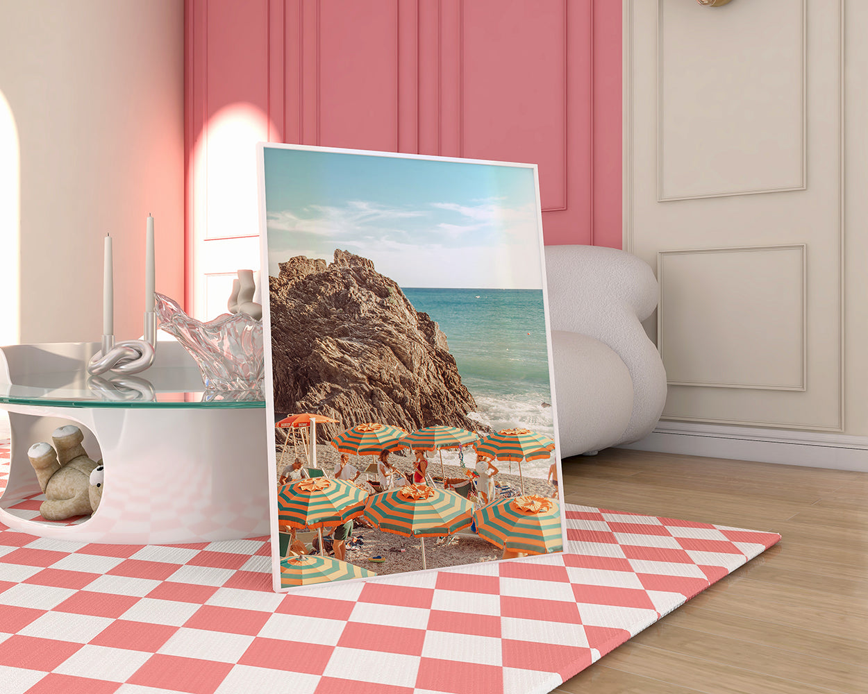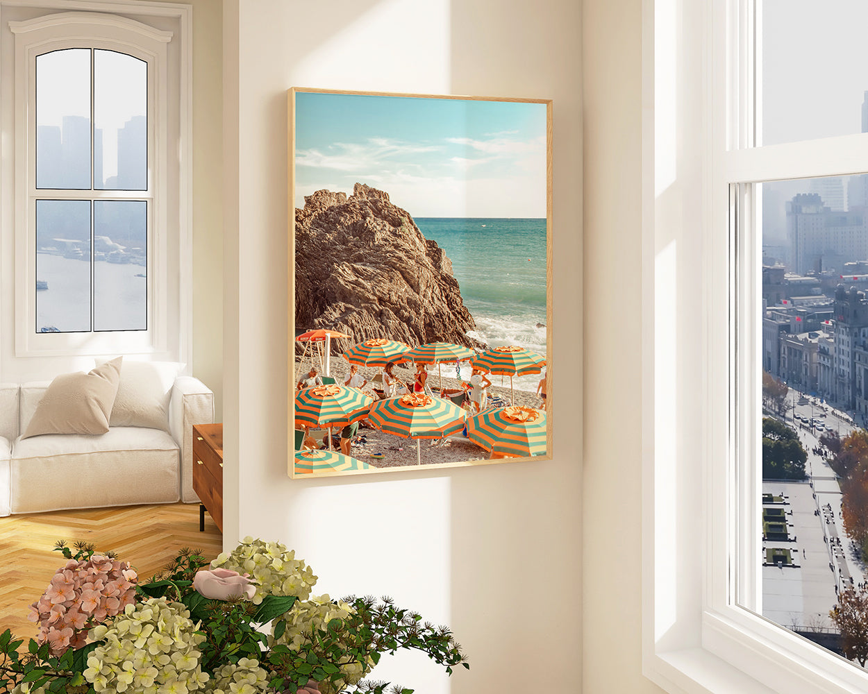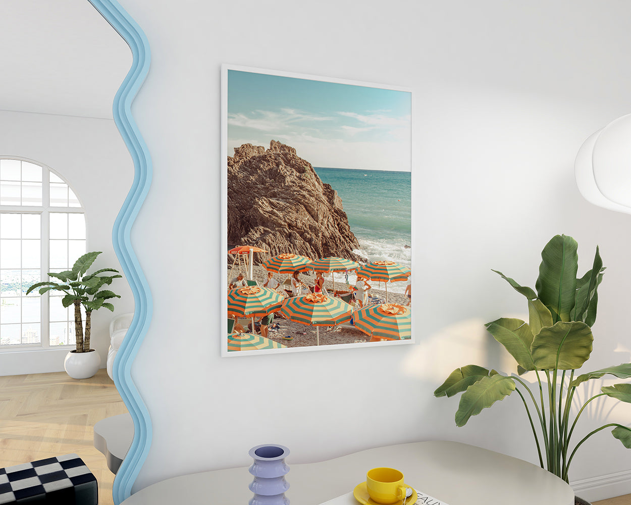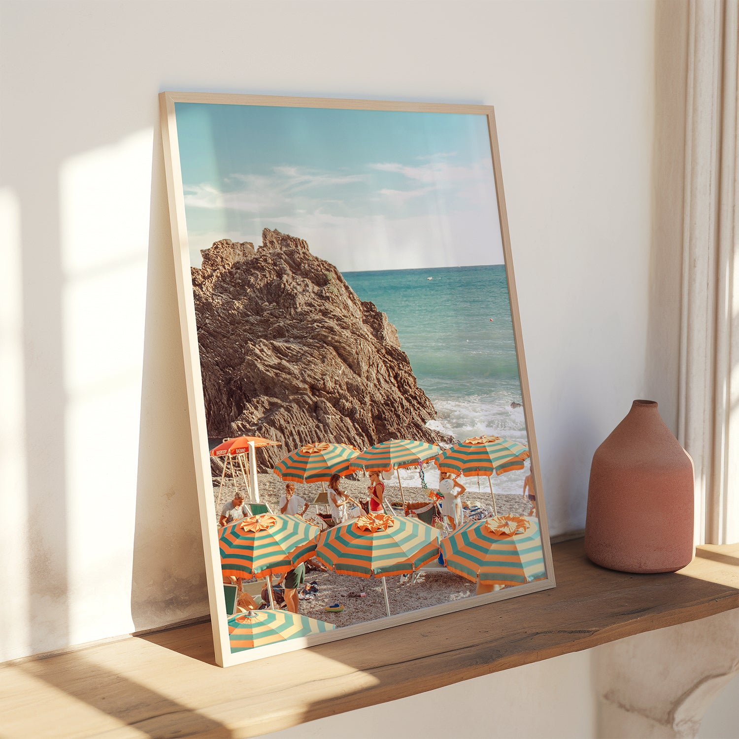 Sunlit cliff, Ligurian-blue water, and a sea of orange-and-green umbrellas—this photograph frames Eden Rock at its summer best. The vertical composition pulls the eye from lively shoreline to the iconic perch above, bringing instant colour and a little Cinque Terre sparkle to your space.