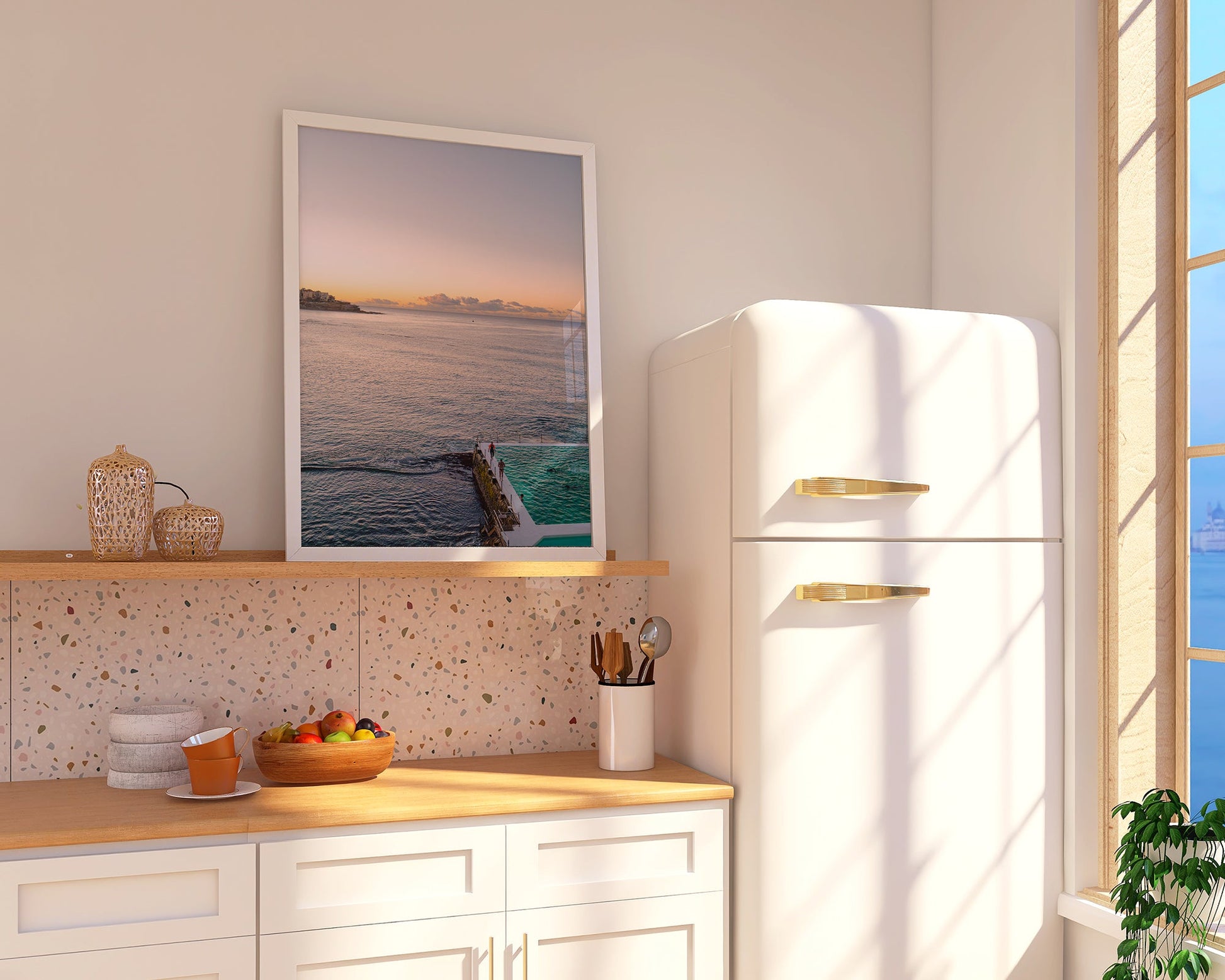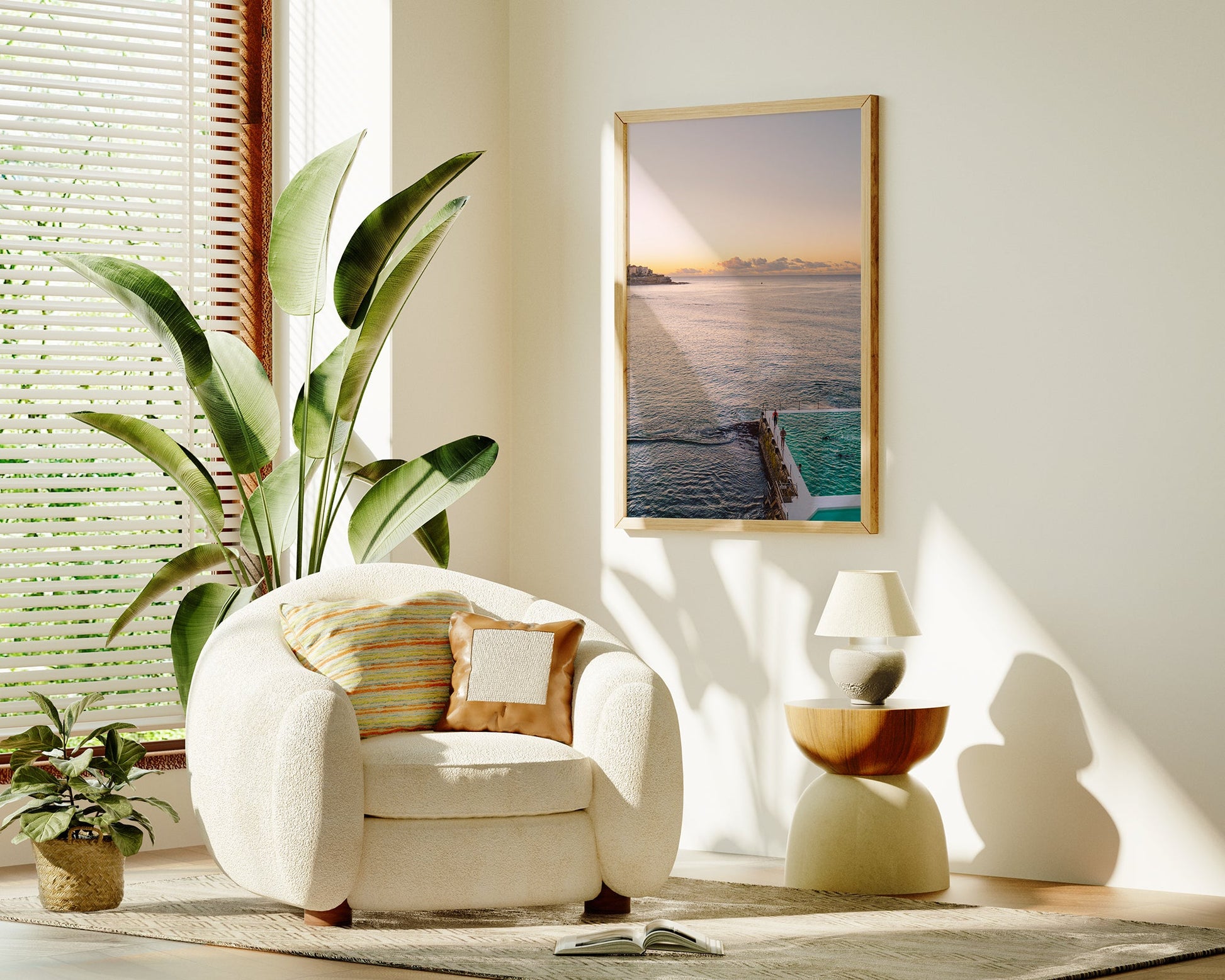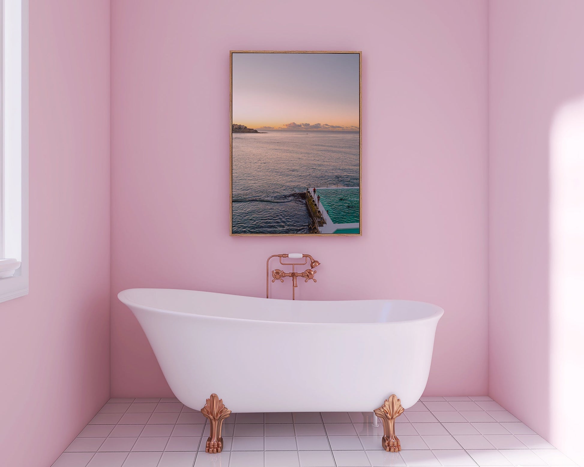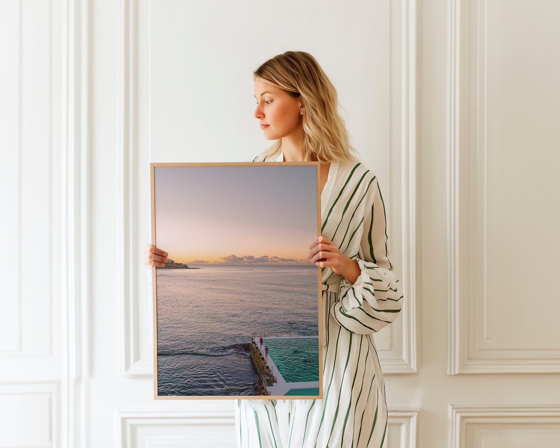 First light is the most magical time down at Bondi Beach. It's the perfect time to see incomparably beautiful colours reflecting off the sea. This fine art photographic print captures the first rays of sun as they reach over the horizon and warm one of the most beautiful places on the earth.