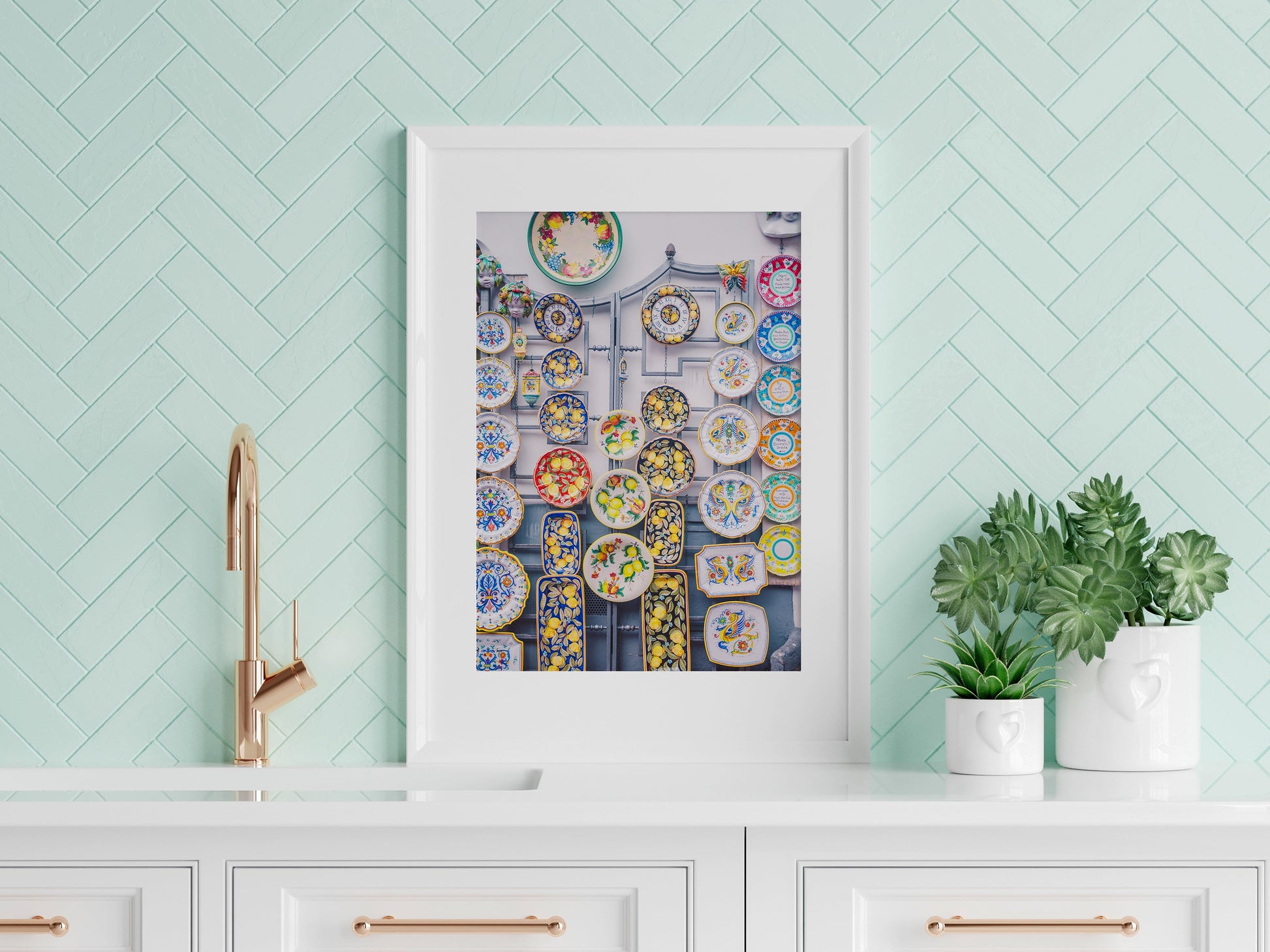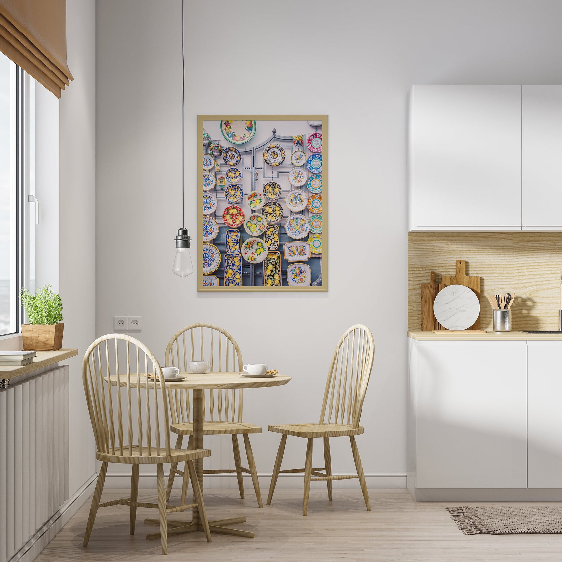 This vibrant image showcases the iconic hand-painted plates of Positano, known for their bright colours and intricate designs. Printed on high-quality paper, this print will add a pop of colour to any room. Perfect for any lover of Italian culture, ceramics or folk art, our colourful Ceramic Positano Plate Photography Print is a must-have for anyone who appreciates the beauty of life's simplest pleasures.