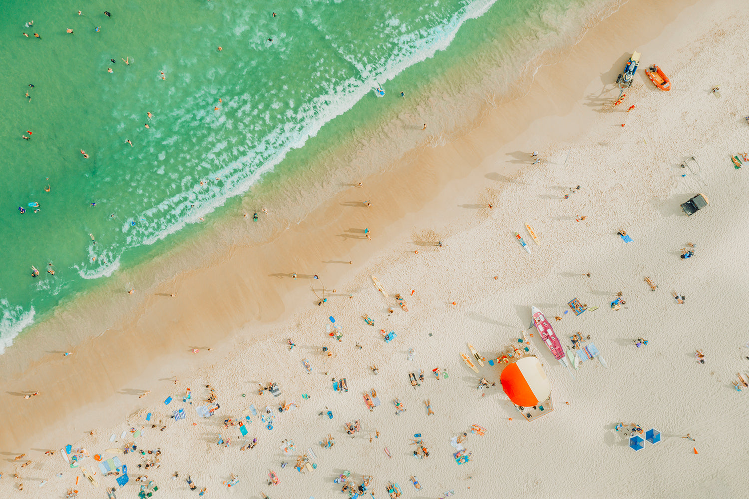Get a bird's eye view of Bondi Beach with this stunning aerial print. Featuring the iconic red and yellow colours of the Bondi surf lifesaving club, it's a warm and inviting image.