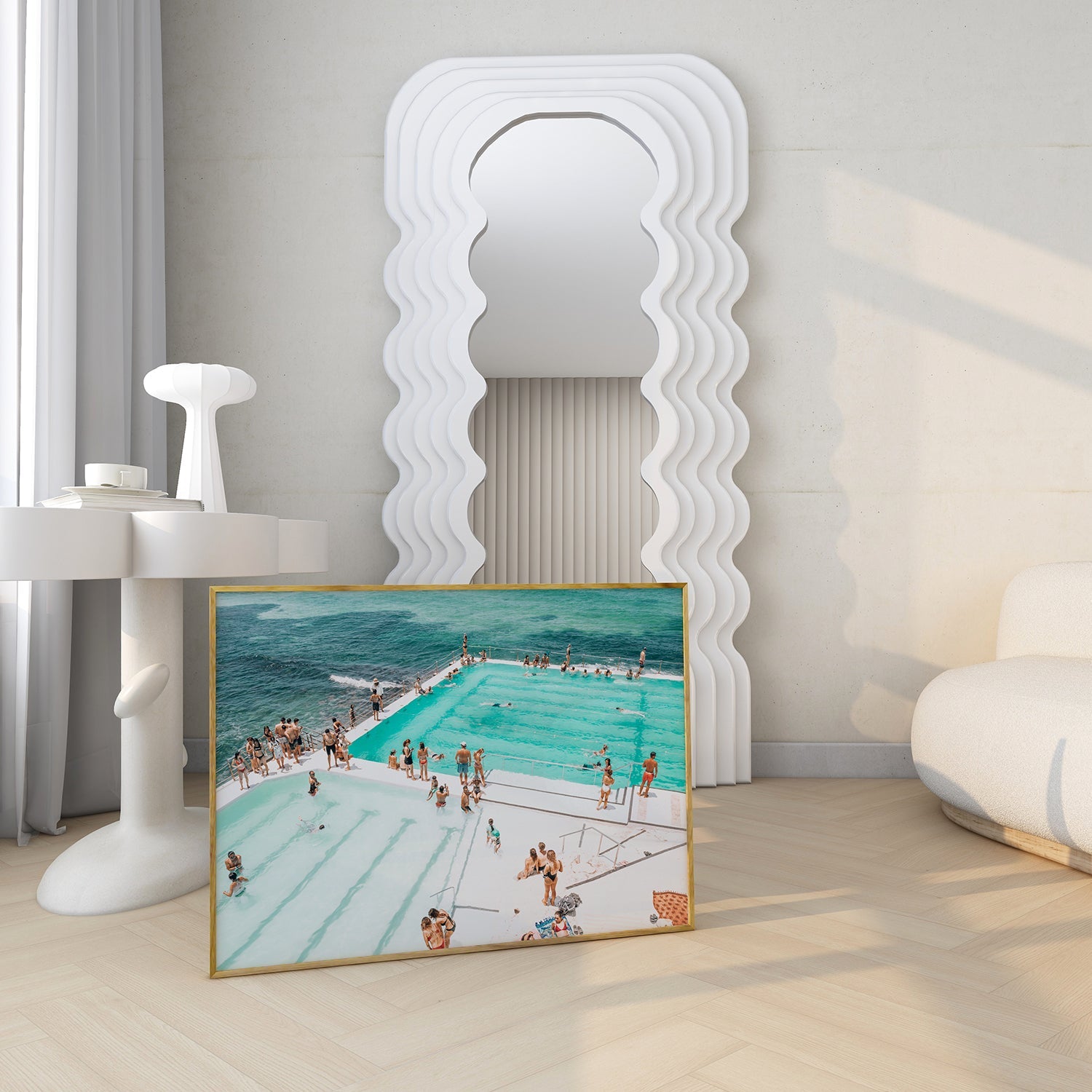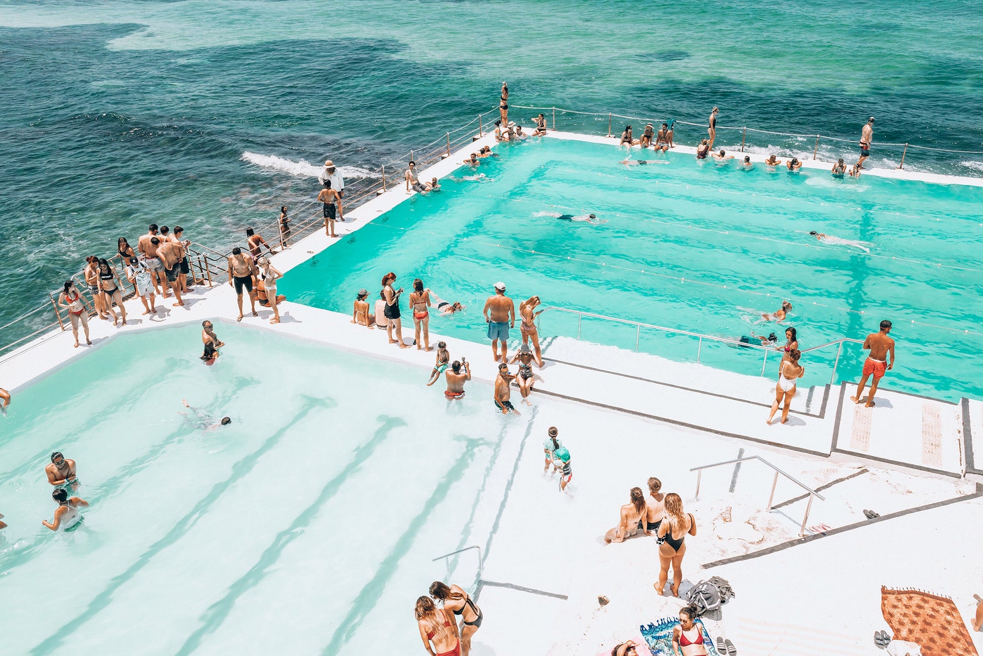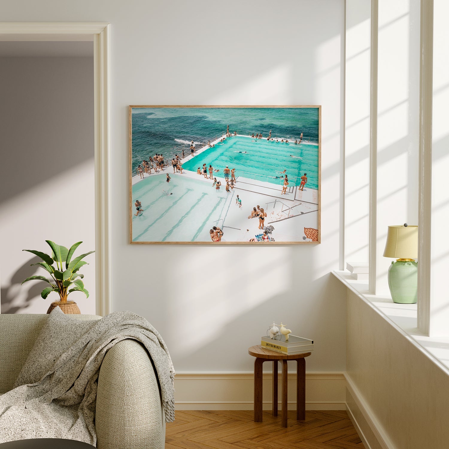 Sun's out, Fun's out captures a bustling summer day at Bondi Icebergs. Beach goers soak up the sun, relish in the lively atmosphere and the refreshing ocean breeze. This print is a celebration of carefree moments, friendship and the sheer bliss of a perfect summers day at one of Australia's most beloved destinations.