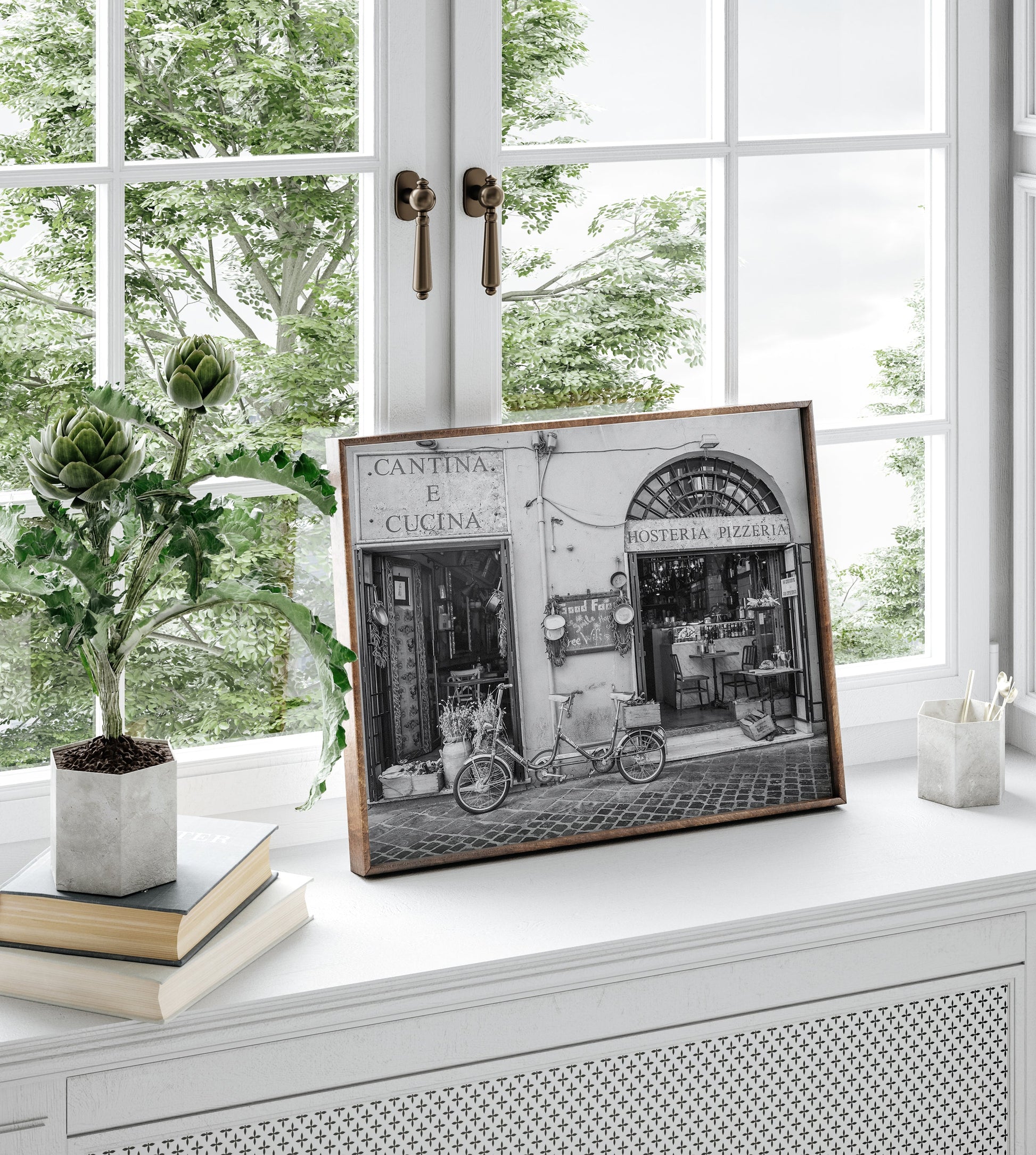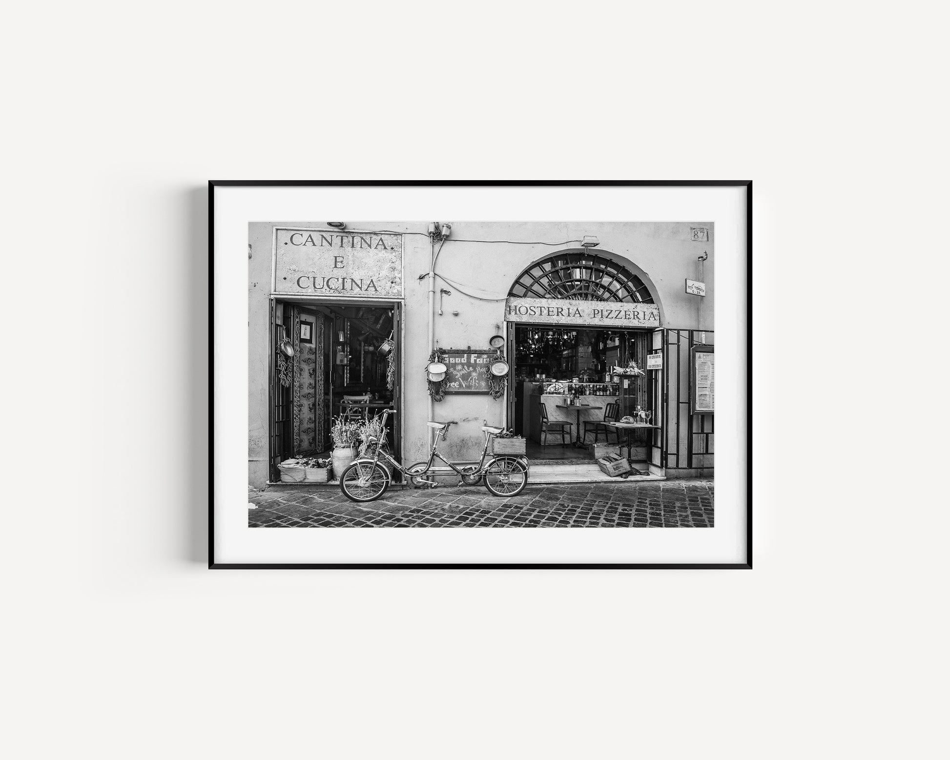 The prettiest Pizzeria on the streets of Rome, complete with a traditional Italian 2 seater bike in vintage black and white.